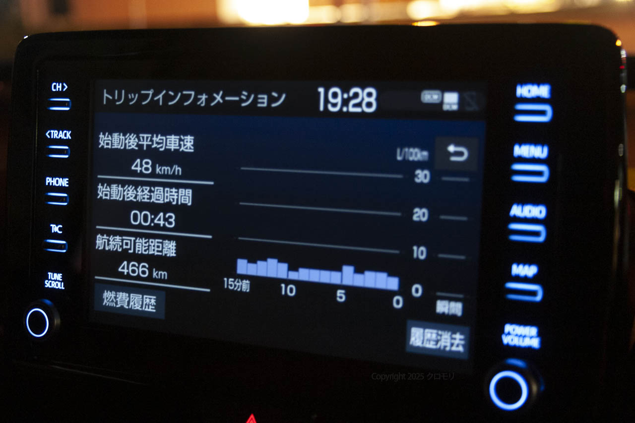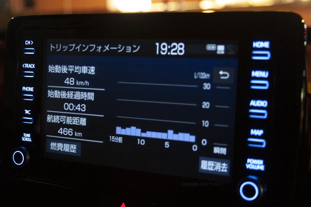 燃費計の表示単位を「L/100km」に変更して、燃費グラフの瞬間燃費部分を見る事で分かる。これを見ると、エアコンのオンオフはアクセルオフでエンジンに燃料を送るどうかに影響を与えているようだ。